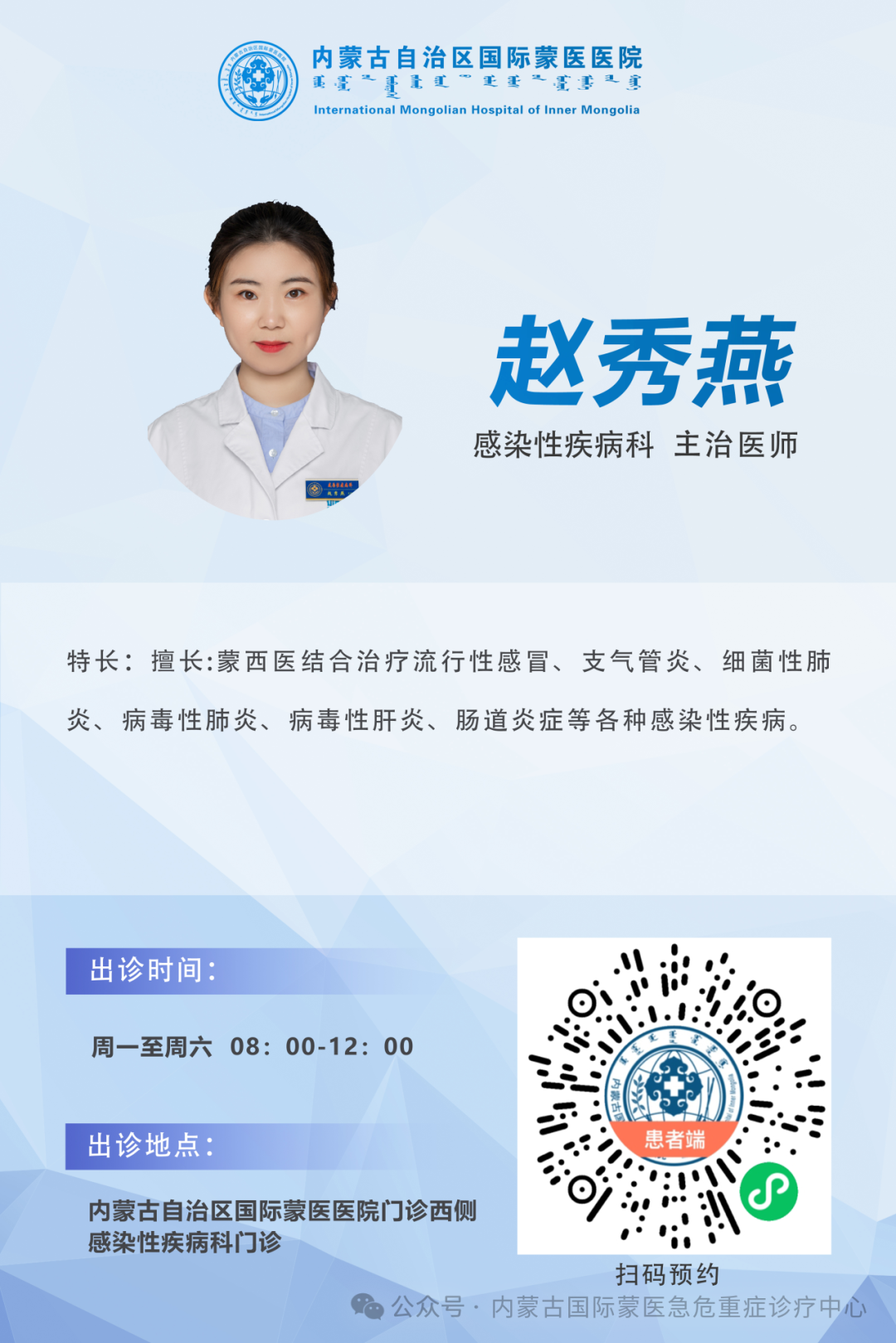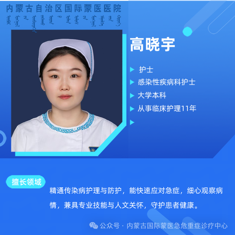 注意事项 04 1. 皮试后24小时内,注射部位避免沾水、抓挠,勿涂抹药膏或化妆品,以防感染或影响结果判断。 2. 若注射部位出现轻微红肿、瘙痒为正常反应,无需特殊处理;若出现严重红肿、水疱、破溃或全身不适,需及时就医。 3. 以下人群暂不建议进行该试验:发热(体温≥38℃)者、皮肤有湿疹/皮炎者、严重心肝肾疾病患者、过敏体质者、妊娠期及哺乳期女性(需提前咨询医生)。 预约与咨询 05 就诊地点:感染性疾病科门诊 咨询电话:5182167、5187584 如有需求,可前往我科室咨询预约,我们将为您提供专业规范的检查服务。 科室介绍 内蒙古自治区国际蒙医医院急危重症诊疗中心感染性疾病科是根据国家卫健委的要求由感染性疾病科门诊(包括发热门诊、肠道门诊)、急危重症诊疗中心感染性疾病科病房组建而成,是我区中蒙综合医院中规模最大的专业科室。其主要职能为负责传染病(尤其是高致病力传染病)的筛查和感染性疾病的诊治。 一楼内设有CT室、药房、PCR检验室、检验科、候诊区、隔离观察室、抢救室、治疗室等区域;二楼为急危重症诊疗中心感染性疾病科病房,开放床位13张,全部为单人单间设置,配备独立卫生间,适合收治传染病及感染性疾病患者,就医环境舒适便利。 专家介绍