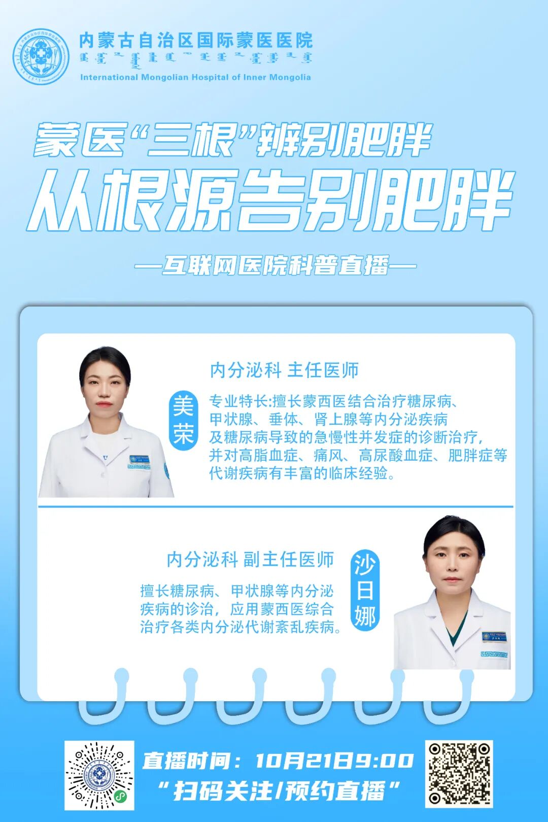 10月21日,我院内分泌科主任医师美荣、副主任医师沙日将做客互联网医院直播间,带您从蒙医"三根"理论入手,学会辨别肥胖类型,实现从根源调理,找回身心轻盈。