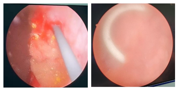 当支架成功置入的瞬间,大量浑浊、脓性的尿液顺着支架迅速引流而出——这意味着被堵塞的“下水道”终于通了。受压的肾脏得到了解救,感染源头被有效控制。手术历时短,效果立竿见影。