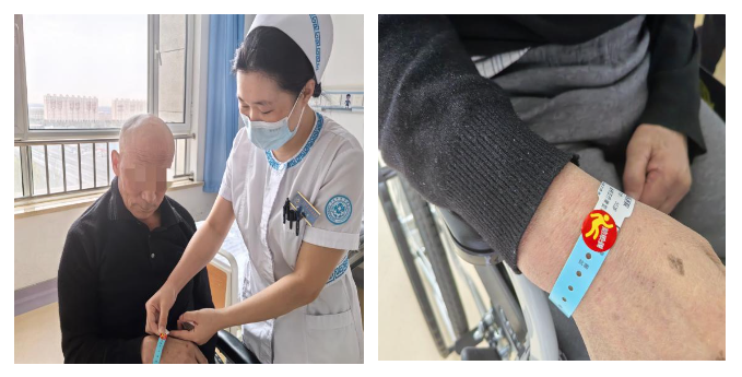 针对老年及行动不便的跌倒高风险患者,护理团队将红色跌倒标识贴直接粘贴于患者腕带。与传统床头卡提示相比,这种随患者移动的标识确保了医护人员和家属在患者床旁护理、外出检查或走廊活动时,都能第一时间识别其跌倒风险等级,及时采取防护措施,为患者安全增添"双保险"。