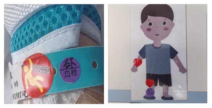 在血栓预防方面,护理团队采用紫色血栓标识贴,同时在患者腕带和床头人像卡的高风险肢体位置进行标注。这种双重标识系统使医护人员在日常护理中能够迅速掌握患者血栓风险部位,精准实施气压治疗、肢体活动指导等预防措施,构建起严密的血栓防控安全网。