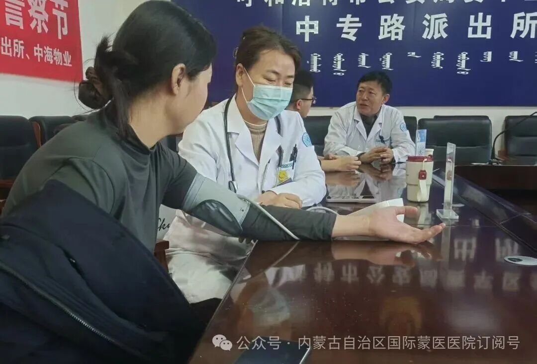 警徽闪耀守护一方安宁,白衣执甲捍卫群众健康。为全面落实爱警暖警举措,精准守护一线警务人员身心健康,1月14日,我院联合呼和浩特市赛罕区中专路派出所开展主题为“警医同行护平安 携手共庆警察节”义诊活动。传统内疗科、体检中心、消化二科、急诊科、老年病科、五疗脑病科、感染疾病科等多学科骨干医师组建医护团队,提供一站式诊疗服务。 义诊现场,医护团队充分发挥蒙医特色诊疗优势,将蒙医诊脉辨证与蒙医适宜技术深度融合,让民辅警足不出警营就能享受便捷高效的医疗关怀。医师们耐心细致地问诊查体、分析病情,针对不同