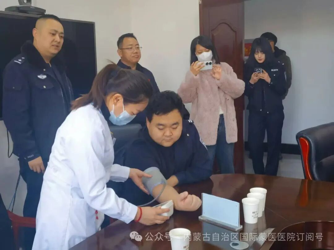 义诊现场,医护团队充分发挥蒙医特色诊疗优势,将蒙医诊脉辨证与蒙医适宜技术深度融合,让民辅警足不出警营就能享受便捷高效的医疗关怀。医师们耐心细致地问诊查体、分析病情,针对不同健康问题现场施治。护理人员有序为民警测量血糖、血压,细致记录健康数据并讲解日常防护要点。针对冬季养身,专家们为民辅警量身定制个性化调理方案,传授生活防护小妙招,切实解决他们“无暇就医”的后顾之忧。“平时忙巡逻办案,根本抽不出时间去医院检查,这次医院把‘健康服务站’搬进警营,免费检查诊疗,真是太贴心了!”“专家给出的调理方案实用又接地气,句句说到了我们的心坎里!”参与义诊的民辅警纷纷为此次活动点赞。