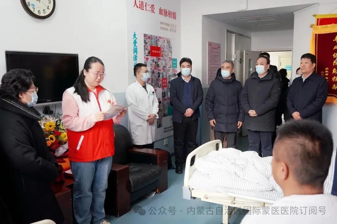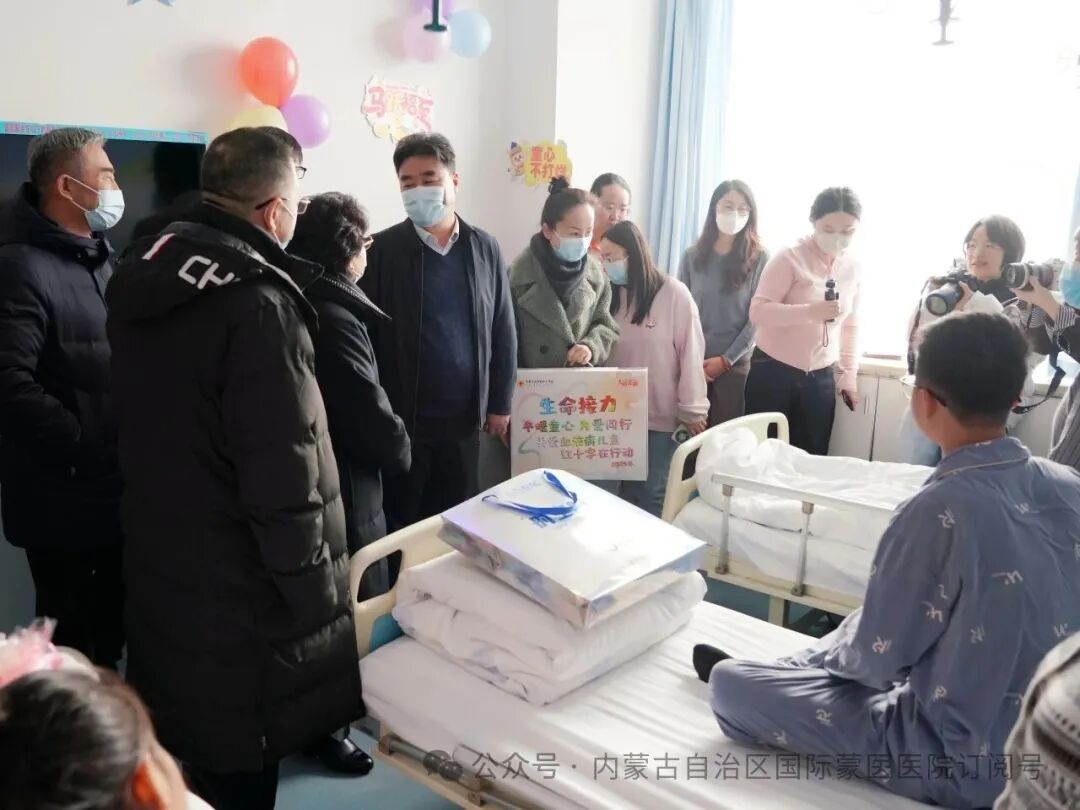 慰问小组首先亲切慰问了我区第232例、第233例造血干细胞捐献者。自治区第232例造血干细胞捐献者是来自阿拉善盟的一名00后民警。2022年,他在无偿献血时主动加入中华骨髓库。2025年10月,得知自己与一名血液病患者初配成功后,他毫不犹豫应允捐献,坚定表示,作为一名民警,救人义不容辞;自治区第233例造血干细胞捐献者是来自鄂尔多斯市的基层残联工作者郝先生。工作中,他深耕助残扶残一线,恪尽职守、兢兢业业。生活中,他热心公益、乐于助人,曾多次参与无偿献血。接到与白血病患者初配相合的通知后,他第一时间回应愿意捐献,并主动调整作息、清淡饮食,坚持每日跑步锻炼,全力以最佳身体状态保障捐献顺利进行。 慰问中,艾丽华副主任向两位捐献者致以崇高敬意。她指出,造血干细胞捐献是一项传递生命希望、彰显人间大爱的崇高事业,承载着无私无畏、守望相助的奉献精神。两位捐献者的善举,不仅为深陷病痛的血液病患者送去了珍贵的生命火种,更用实际行动点亮了他们重获新生的希望之光。希望以此次慰问活动为契机,积极号召更多年轻人主动向捐献者学习,踊跃加入到这支“生命接力”的队伍中来,用爱心与勇气为更多患病家庭带去温暖与希望,让生命的火种不断传递。 慰问造血干细胞捐献者后,艾丽华、杨凤屹、彭建峰等共同参与 “生命接力,冬暖童心” 血液病患儿慰问活动,给孩子们送上慰问礼物,亲切鼓励他们勇敢对抗疾病,早日恢复健康、重返美好生活。 彭建峰书记表示,此次慰问活动不仅让造血干细胞捐献者和血液病患儿感受到了党和政府的关怀与温暖,更凝聚了社会各界对生命健康事业的关注与支持,我院将进一步弘扬红十字精神,为推动全区造血干细胞捐献工作持续开展、营造互助友爱的社会氛围注入强劲动力。