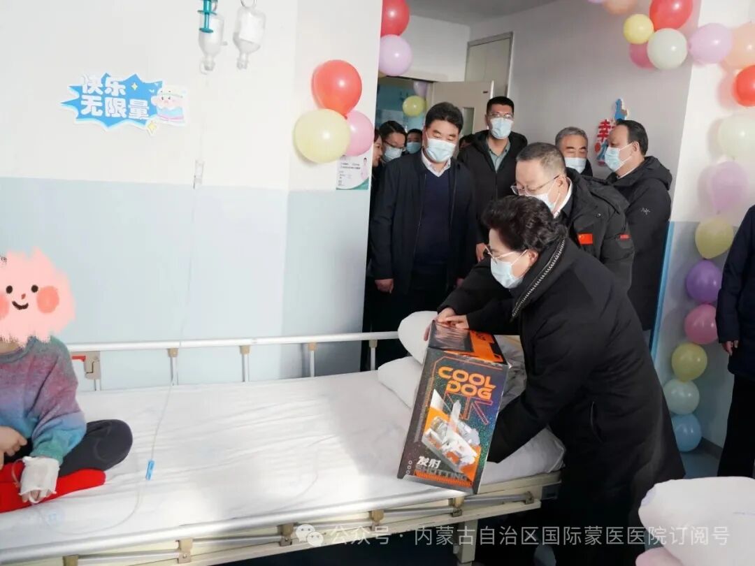 1月9日,内蒙古自治区人大常委会副主任、自治区红十字会名誉副会长艾丽华,自治区红十字会党组书记、常务副会长杨凤屹,自治区残联党组书记、理事长佟国清,阿拉善盟盟委副书记、盟长白海林等一行到我院慰问看望造血干细胞捐献者和血液病患儿。我院党委书记彭建峰及相关科室负责人陪同。