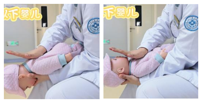 用手夹住孩子两侧颧骨,面部向下,保持头低足高的姿势趴在手臂上,用掌根拍击孩子肩胛骨连线中点处5次。