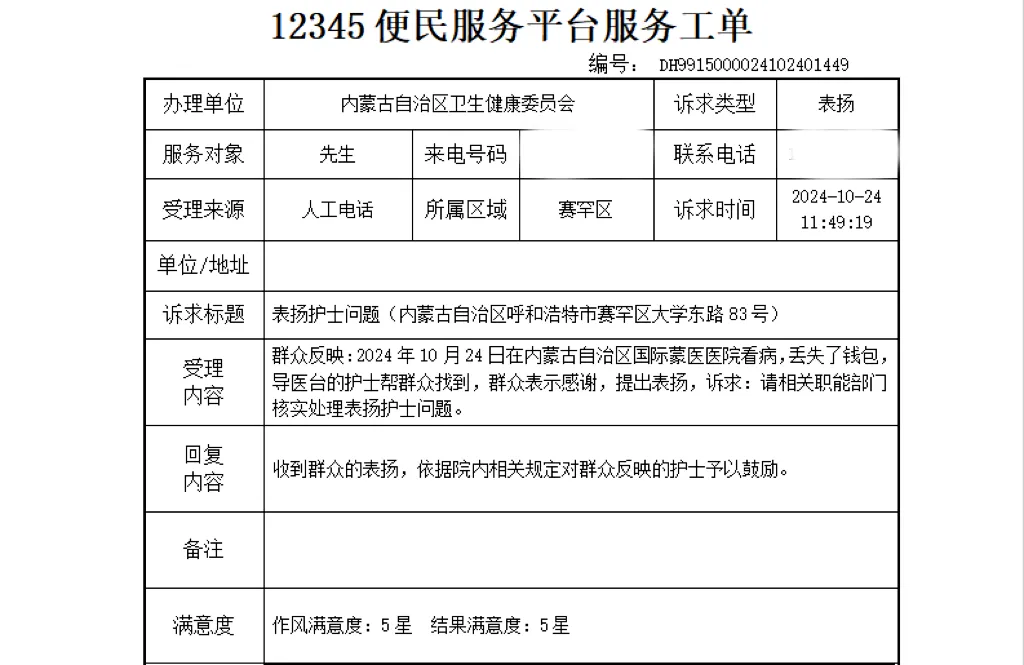 10月24日,我院门诊部收到一封来自12345便民服务平台转来的表扬信,以传达某位患者对医院门诊部导医台工作人员永梅的感激之情。