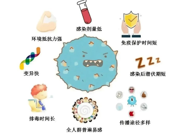 2.诺如病毒感染症 感染后通常12-48小时内就会发病,症状来得比较急: 核心症状:最常见的是呕吐和腹泻,有时会同时出现。呕吐多为剧烈的喷射状,腹泻多为水样便,一般不会有脓血。 其他症状:还可能伴有发热、恶心、腹痛、头痛、乏力等。 特点:症状通常持续2-3天,多数人不用特殊治疗就能自行恢复。但老人、小孩或免疫力弱的人,可能会因呕吐腹泻导致脱水,需要特别注意。 3.诺如病毒传播途径 1. 接触传播:接触污染物表面(如开关、把手等)或直接接触感染者的体液(如呕吐物或粪便)。 2. 食物和水源:食用污染了的食物或饮用受污染的水会导致感染。 3. 空气传播:感染者呕吐或腹泻时,病毒可以通过空气中的气溶胶进入体内。 4. 间接传播:例如,通过共享毛巾、餐具等日常用品,或在集体生活环境中共享卫生设施,也可能导致传播。 4.诺如病毒防控措施 做好手卫生 严把食品卫生关 注意饮用水卫生 环境预防性消毒 保持环境的清洁,定期使用含氯消毒剂对教室、食堂、卫生间、玩具、教具等高频接触表面进行消毒,使用消毒剂时应按照说明书正确配比和规范使用,现配现用。