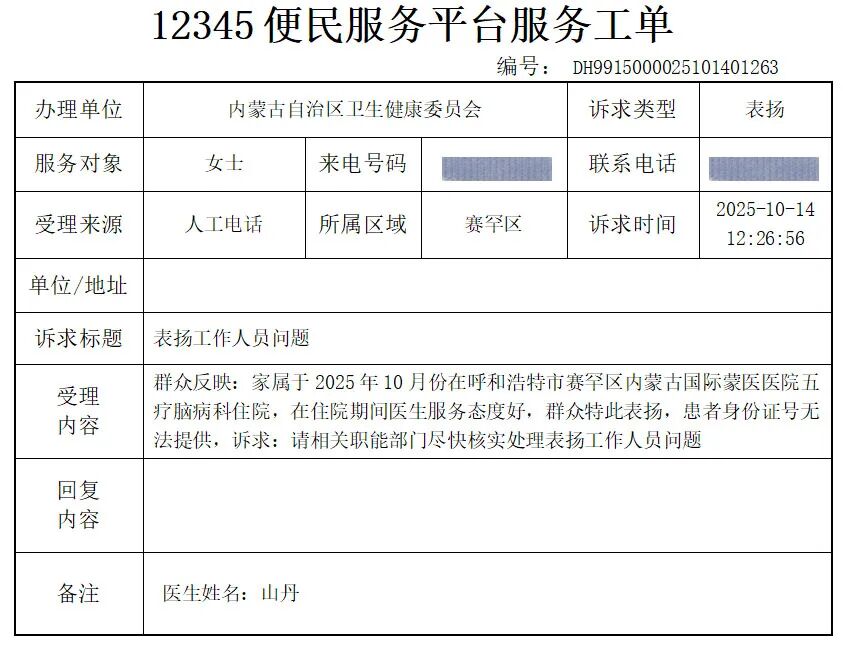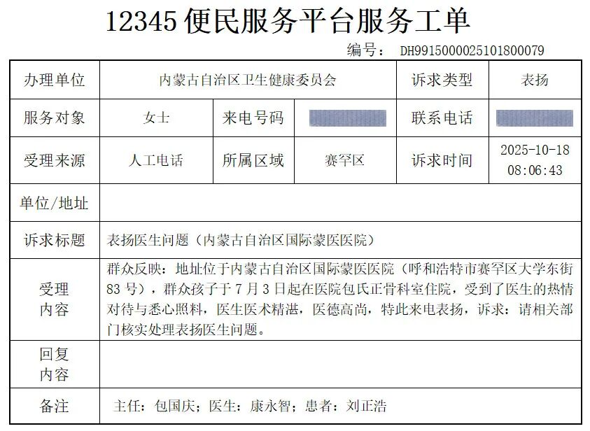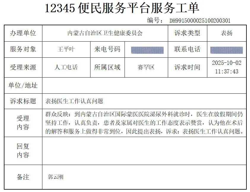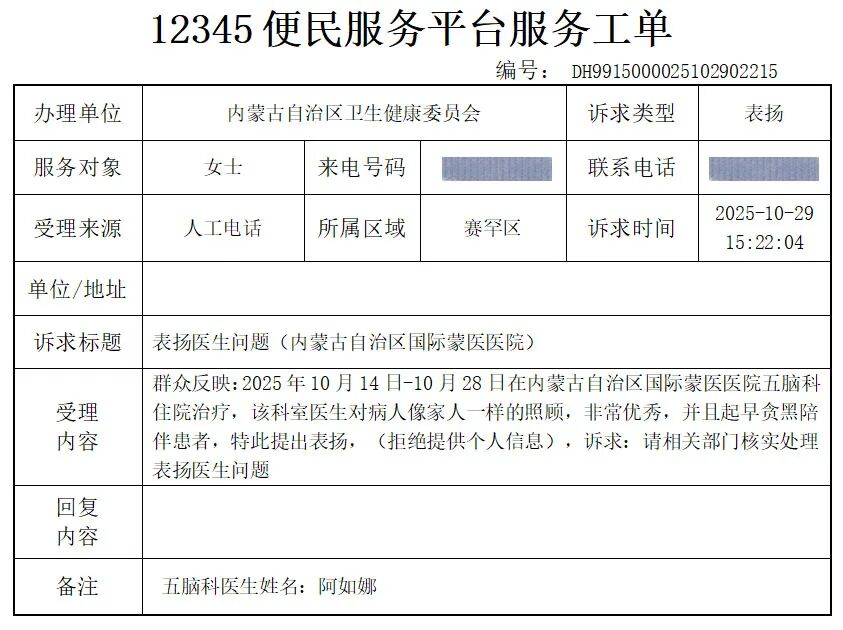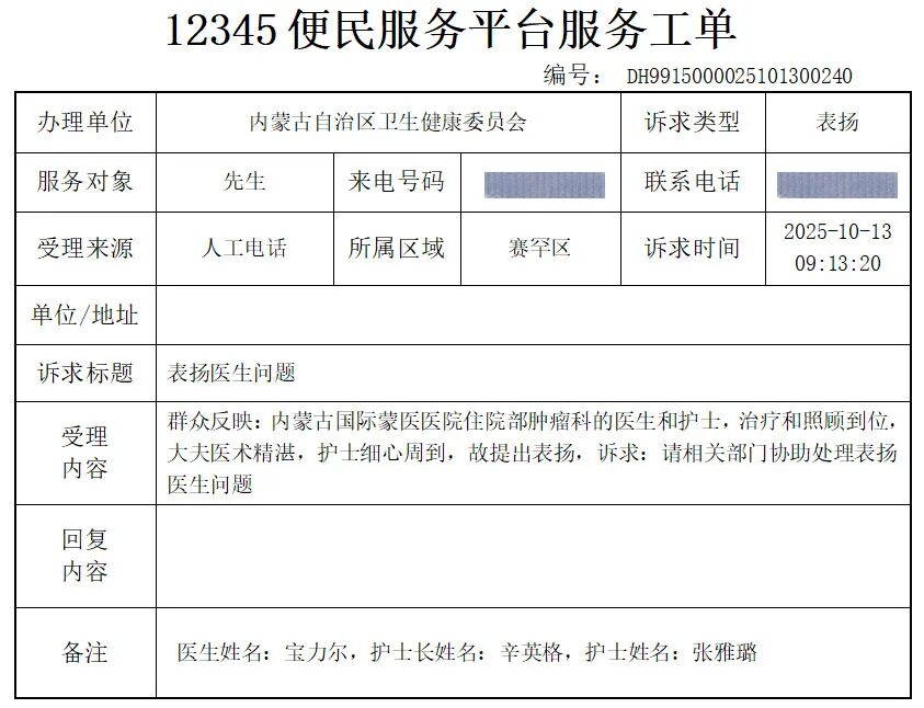 『医德医风|12345政务热线表扬』内蒙古自治区国际蒙医医院收到政务热线表扬的医护人员