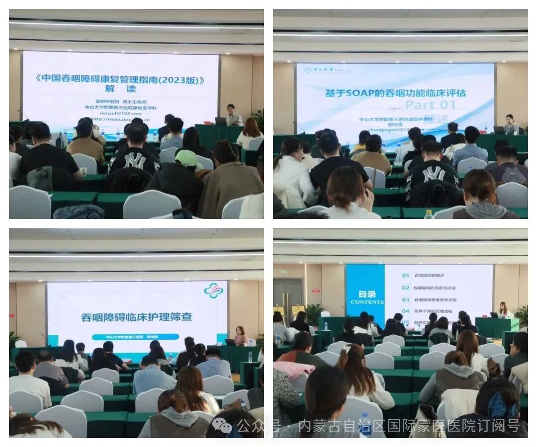 彭建峰书记向长期以来给予支持的各方致以诚挚谢意。他详细介绍了医院及相关科室的基本情况,强调此次合作引入先进康复技术并深度融入蒙医特色,不仅能有效填补区域康复医疗领域的技术空白,更将显著提升科室核心竞争力与全区康复医疗体系建设整体水平。双方将以此次合作为契机,开展多维度深度协作,切实把政策优势转化为惠及民众的健康福祉。同时,他寄语全体参训人员,希望大家潜心钻研、学以致用,深刻领悟技术精髓,切实提升临床服务能力。 郝小金处长表示,此次活动是专科区域医疗中心项目的重要举措,旨在对接广东优质康复资源,提升我区康复能力,推动蒙医药(非遗)传承创新。希望双方建立长效合作机制,让医院推广的技术惠及广大群众。 窦祖林教授充分肯定了此次合作的重要意义,深入阐述了这一合作对推动康复医学领域进步的深远影响,同时对内蒙古地区未来康复医学的发展前景满怀信心与期待。 ▲与会领导为肉毒毒素注射技术推广基地及吞咽障碍诊疗技术推广基地揭牌 同期,窦祖林、李超、谢纯青、陈琼梅等专家围绕《中国吞咽障碍康复管理指南(2023版)》解读、肉毒毒素在康复科的应用、基于SOAP的吞咽障碍临床评估、吞咽障碍患者营养管理及临床护理筛查等方面开展专题授课。 此次签约挂牌仪式暨培训班的举办,标志着我院在康复医学领域的发展迈出了关键一步。我院将以两大技术推广基地为依托,持续深化与广东省康复医学会的合作,充分发挥蒙医特色优势,不断提升康复医疗服务水平,为全区人民的健康保驾护航,助力全区专科区域医疗中心建设再上新台阶。