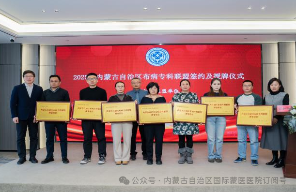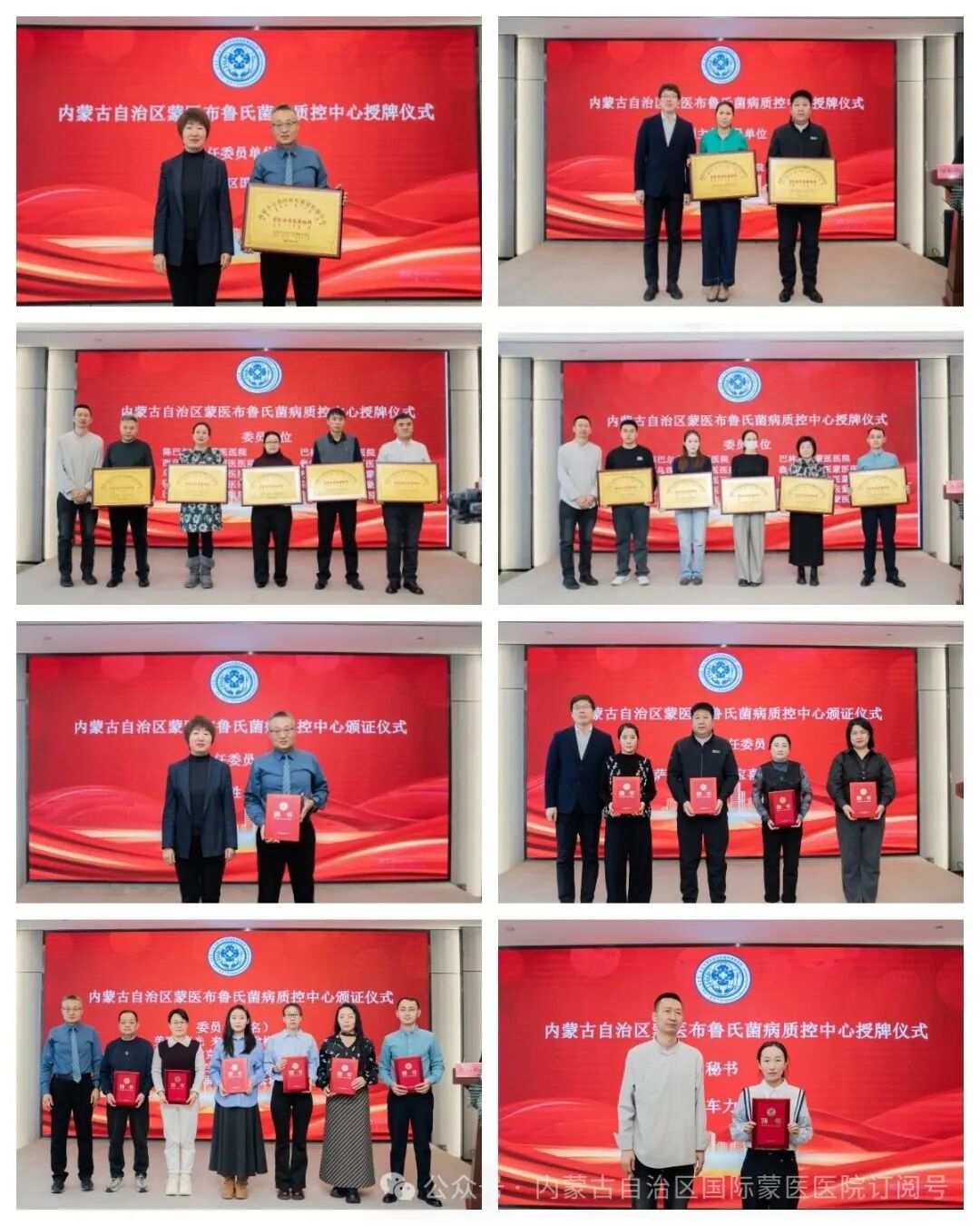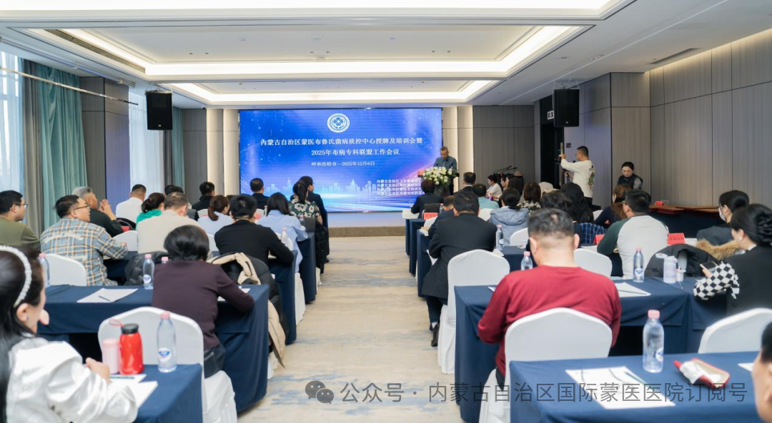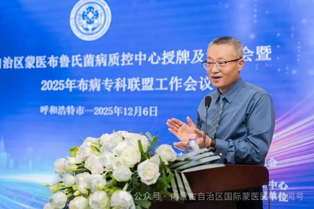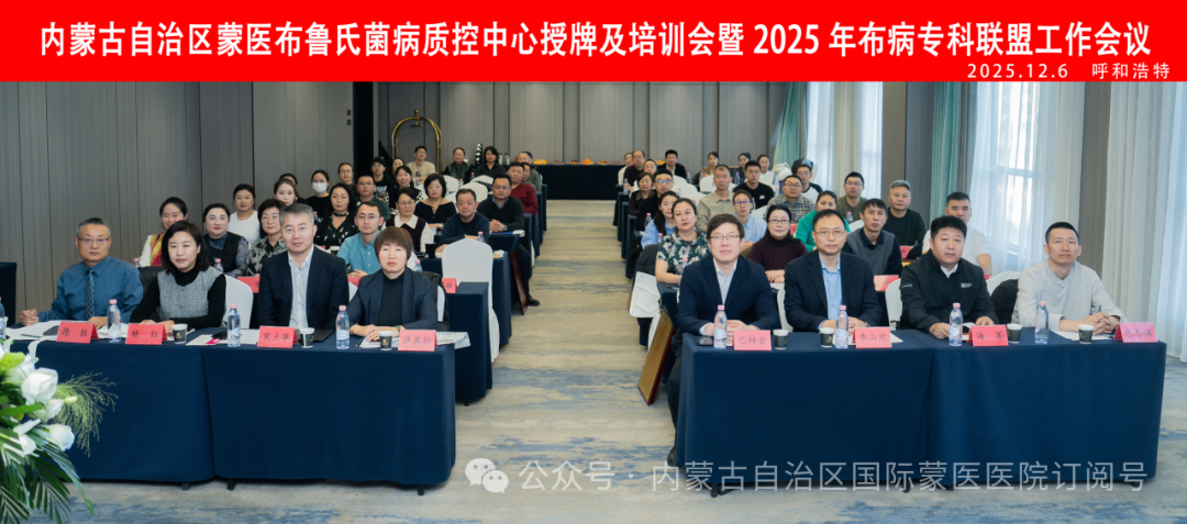为有效规范中医(蒙医)医疗质量控制中心(以下简称“质控中心”),强化自治区布鲁氏菌病(以下简称“布病”)医疗质量管理优化诊疗行为,充分彰显蒙医药在布病防治中的独特优势,12月6日,由内蒙古自治区卫生健康委主办,我院联合内蒙古自治区蒙医布鲁氏菌病质控中心、内蒙古自治区布病专科联盟承办的“内蒙古自治区蒙医布鲁氏菌病质控中心授牌及培训会暨2025年布病专科联盟工作会议”在呼和浩特市召开。自治区卫生健康委中医药(蒙医药)服务管理处副处长萨其拉,我院党委副书记巴特金,自治区蒙医布鲁氏菌病质控中心全体成员及单位代表,内蒙古布病专科联盟各成员单位负责人、各盟市布病防治一线专业人员参加会议。会议由我院布病科主任、内蒙古自治区蒙医布鲁氏菌病质控中心主任委员德胜与副主任委员萨如拉共同主持。