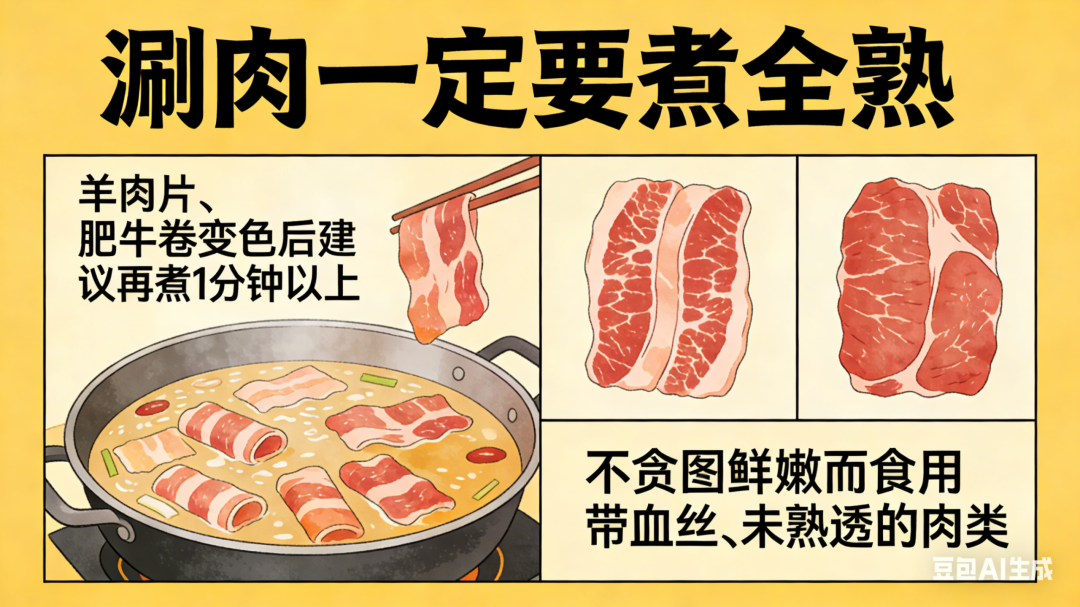 1. 涮肉一定要煮全熟:羊肉片、肥牛卷等,变色后建议再煮1分钟以上,不贪图鲜嫩而食用带血丝、未熟透的肉类。