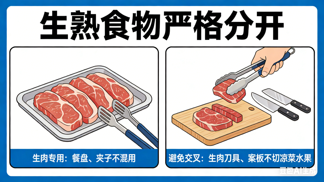 3. 生熟食物严格分开:生肉专用餐盘、夹子,不混用夹取熟食;切生肉的刀具、案板,不直接切凉菜、水果。