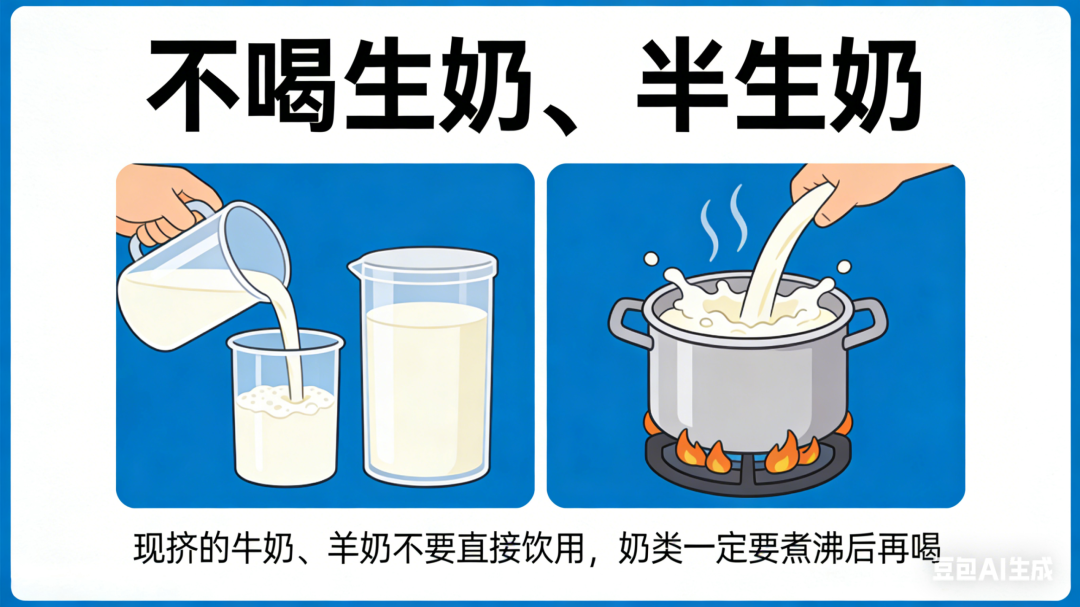 2. 不喝生奶、半生奶:现挤的牛奶、羊奶不要直接饮用,奶类一定要煮沸后再喝。