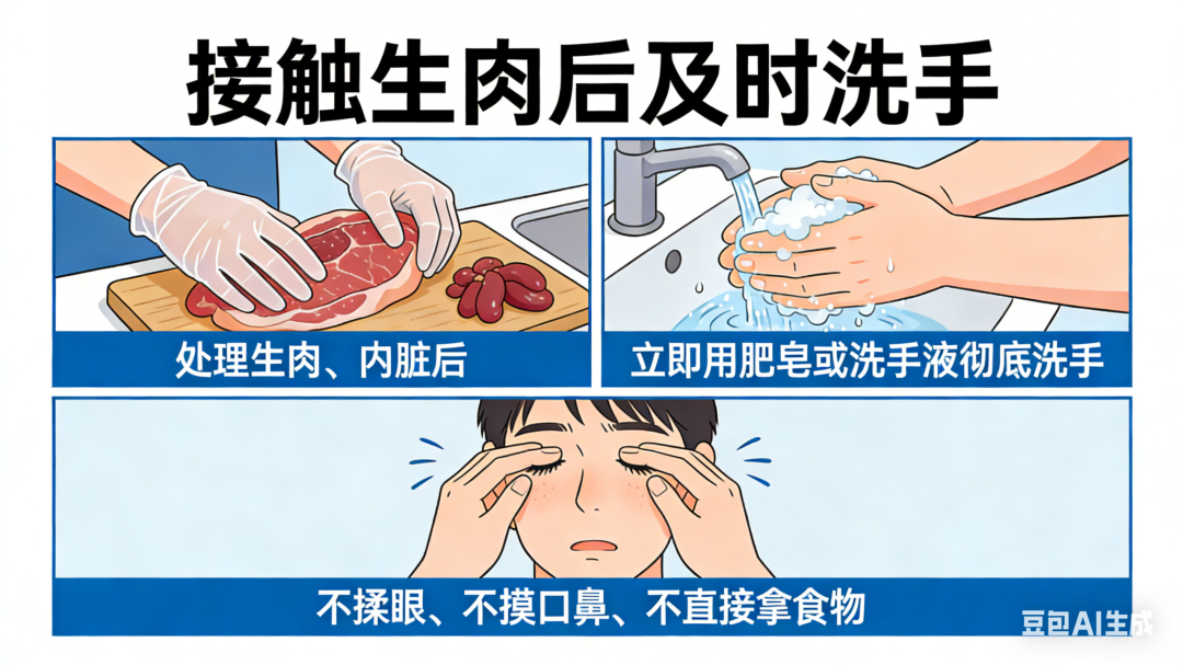 4. 接触生肉后及时洗手:处理生肉、内脏后,立即用肥皂或洗手液彻底洗手,不揉眼、不摸口鼻、不直接拿食物。