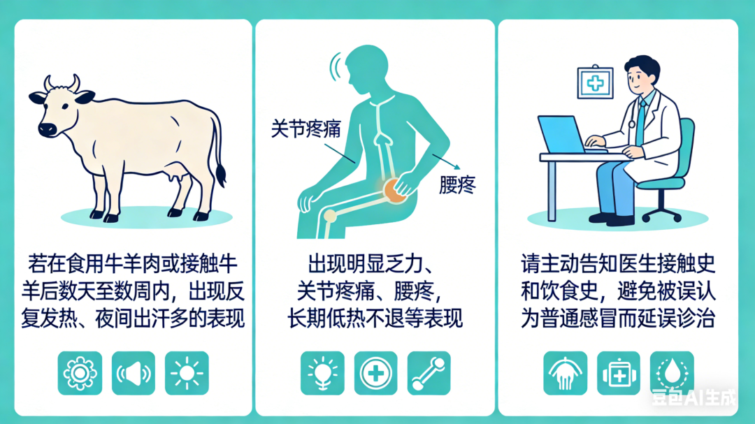 若在食用牛羊肉或接触牛羊后数天至数周内,出现以下表现: