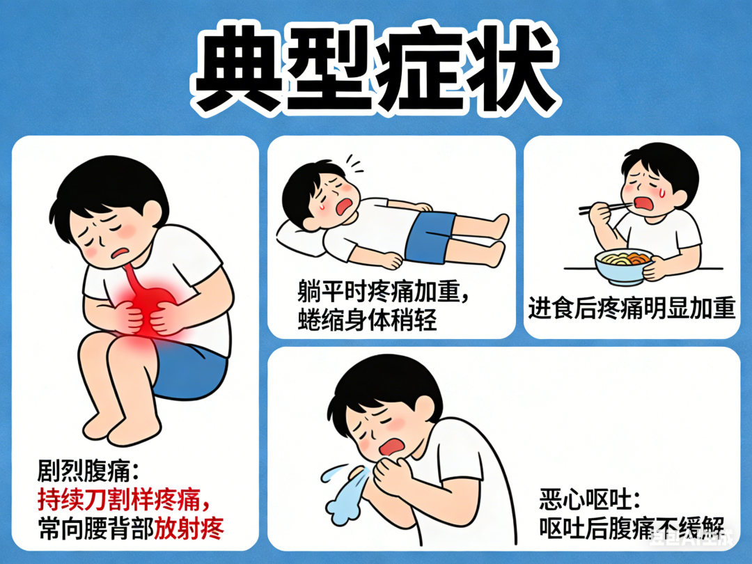 典型症状 1.剧烈腹痛:在上腹部(心窝下)持续刀割样疼痛,常向腰背部放射; 2.弯腰缓解:蜷缩身体时疼痛稍轻,躺平时加重; 3.进食后疼痛明显加重; 4. 恶心呕吐:呕吐后腹痛不缓解。 伴随症状 1.轻者有低热,重者可出现高热、寒战; 2.消化不良、腹胀、嗳气; 3.严重时皮肤、眼睛发黄。 02 春节防“胰”指南:给胰腺放个假