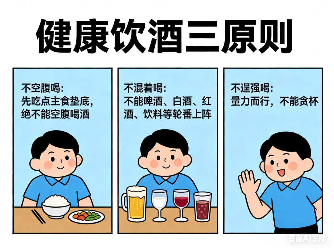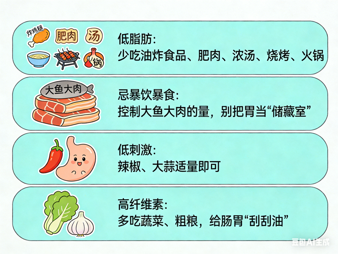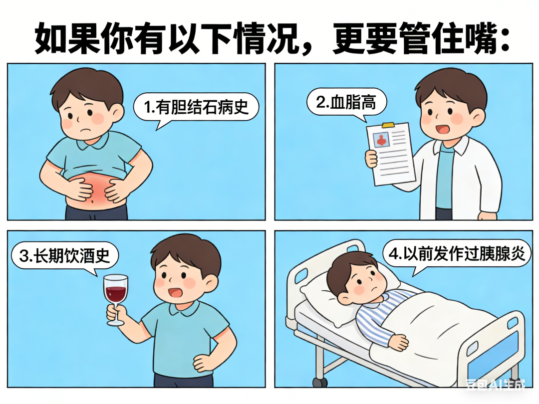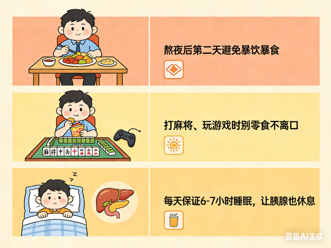 01 1.低脂肪:少吃油炸食品、肥肉、浓汤、烧烤、火锅; 2.忌暴饮暴食:控制大鱼大肉的量,别把胃当“储藏室”; 3.低刺激:辣椒、大蒜适量即可; 4. 高纤维素:多吃蔬菜、粗粮,给肠胃“刮刮油”。 02 1.不空腹喝:先吃点主食垫底,绝不能空腹喝酒; 2.不混着喝:不能啤酒、白酒、红酒、饮料等轮番上阵; 3.不逞强喝:量力而行,不能贪杯。 03 1.熬夜后第二天避免暴饮暴食; 2.打麻将、玩游戏时别零食不离口; 3. 每天保证6-7小时睡眠,让胰腺也休息。 04 如果你有以下情况,更要管住嘴: 1.有胆结石病史; 2.血脂高; 3.长期饮酒史; 4. 以前发作过胰腺炎。