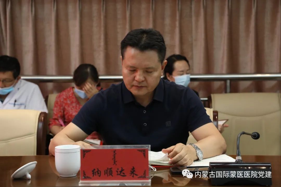 纳顺达来副院长在发言中表示,认真学习贯彻习近平总书记“七一”重要讲话精神有五点心得感受,习近平总书记“七一”重要讲话一是回顾了中国共产党的百年奋斗光辉历程,从50多名党员发展成为如今拥有9500万名党员的世界第一大执政党;二是高度评价了中国共产党的伟大成就,从中国共产党站起来、富起来再到强起来以及庄严宣告脱贫攻坚取得全面胜利;三是体现了中国共产党的制度优势,在中国共产党的领导下,新冠肺炎疫情防控工作取得了举世瞩目的成绩;四是宣告了实现了第一个百年奋斗目标,正在意气风发的向着第二个百年奋斗目标迈进的历史征程;五是体现了伟大的建党精神,中国共产党的核心内涵就是人民,支撑一代一代共产党人为人民的利益而奋斗的坚定信念。