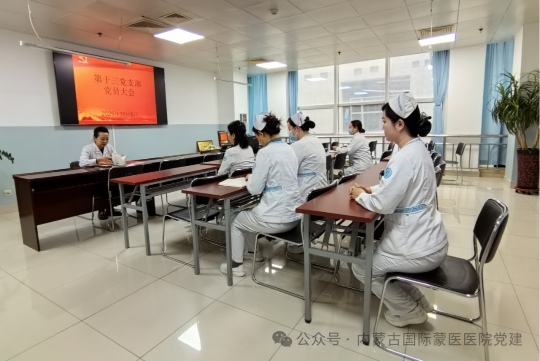 2025年11月6日,内蒙古自治区国际蒙医医院第一党总支第一党支部召开集中学习会。会上,支部书记领学了《习近平关于〈中共中央关于制定国民经济和社会发展第十五个五年规划的建议〉的说明》《中国共产党第二十届中央委员会第四次全体会议公报》《内蒙古自治区党委党的建设工作领导小组印发<关于巩固深入贯彻中央八项规定精神学习教育成果进一步深化“感党恩、听党话、跟党走”群众教育的工作方案>的通知》《内蒙古自治区卫生健康委关于印发〈内蒙古自治区公立医院内设机构党支部参与科室重大问题决策规则示范文本(试行)〉的通知》。会议强调,全体党员要深刻理解党的二十届四中全会精神核心要义,切实把思想和行动统一到党中央的决策部署上来,紧密结合医院实际,将全会精神融入到党建、宣传各项工作中,以实际行动推动医院高质量发展,为建设健康中国贡献力量。