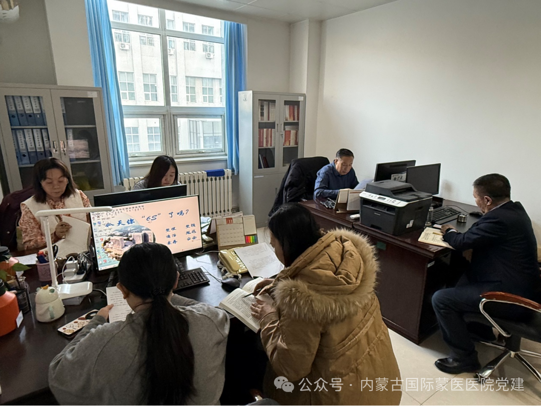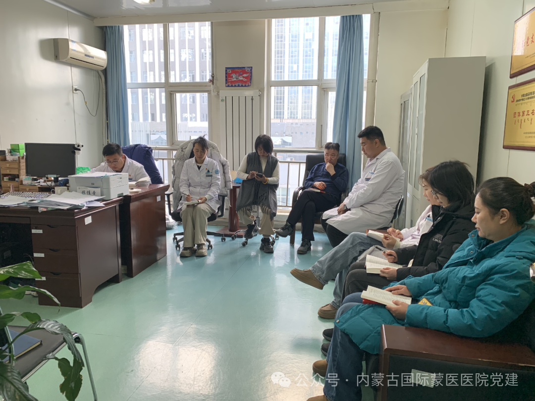 2025年12月1日,内蒙古自治区国际蒙医医院第一党总支第五十五党支部召开学习研讨会。会上,支部书记领学了《习近平致信祝贺中国志愿服务联合会第三届会员代表大会召开》《习近平:认真学习贯彻党的二十届四中全会精神高标准建设海南自由贸易港》和《习近平谈治国理政》第五卷部分内容。随后,支部党员围绕学习贯彻党的二十届四中全会精神和《习近平谈治国理政》第五卷开展专题研讨。大家纷纷表示,要认真学习贯彻全会精神,切实把思想和行动统一到党中央决策部署上来,不断提高政治站位、锤炼实干作风、提升服务能力,将学习成果转化为推动医院高质量发展的强大动力。