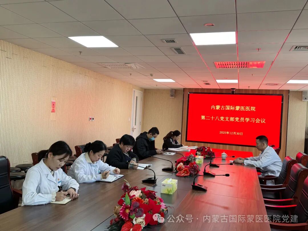2025年12月31日,内蒙古自治区国际蒙医医院第四党总支第二十八党支部召开集中学习会。会上,支部书记领学了《中央经济工作会议在北京举行习近平发表重要讲话》和《习近平谈治国理政》第五卷部分内容,并宣讲了党的二十届四中全会精神。会议要求,全体党员要持之以恒强化理论学习,着力将党的创新理论深度融入医疗保障、管理服务全过程,为凝心聚力推进医院高质量发展提供坚强保障。