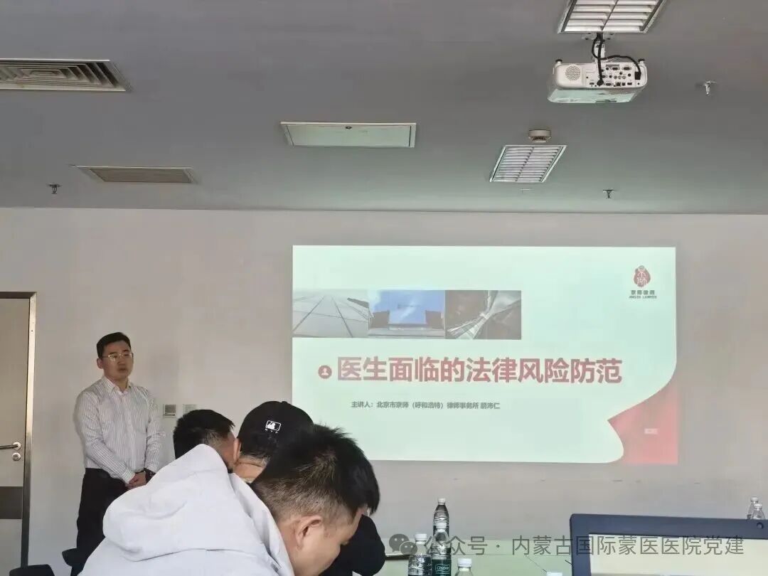 2025年12月27日,内蒙古自治区国际蒙医医院第四党总支第五十六党支部联合内蒙古医科大学第二附属医院第五党支部、呼和浩特市第六中学党总支、内蒙古自治区中医医院麻醉手术党支部开展主题党日活动。活动中,北京京师律师事务所蔚沛仁律师以《医生面临的法律风险防范》为题作专题授课,并围绕日常诊疗活动中常见的法律风险点展开了交流讨论。下一步,第五十六党支部将以此次活动为契机,持续深化学习成果转化,引导全体党员恪守职业道德、严格依法执业,以更规范的诊疗行为、更优质的医疗服务守护人民群众生命健康。