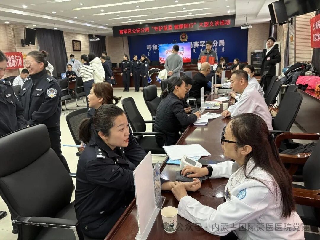 2026年1月19日,内蒙古自治区国际蒙医医院第四党总支第五十六党支部赴赛罕区公安分局开展“守护蓝盾,健康同行”主题党日活动。活动中,党员医务人员耐心倾听警务人员的健康问题,详细讲解了常见职业病的预防知识,并围绕饮食调理、科学运动、心理健康、合理用药等方面提供了个性化建议,引导大家树立“早预防、早发现、早治疗”的健康观念。此次活动依托蒙医药文化“六进”活动为载体,切实将优质医疗资源送到警营一线,向基层警务人员提供了精准、便捷的健康服务,共惠及民辅警100余人。