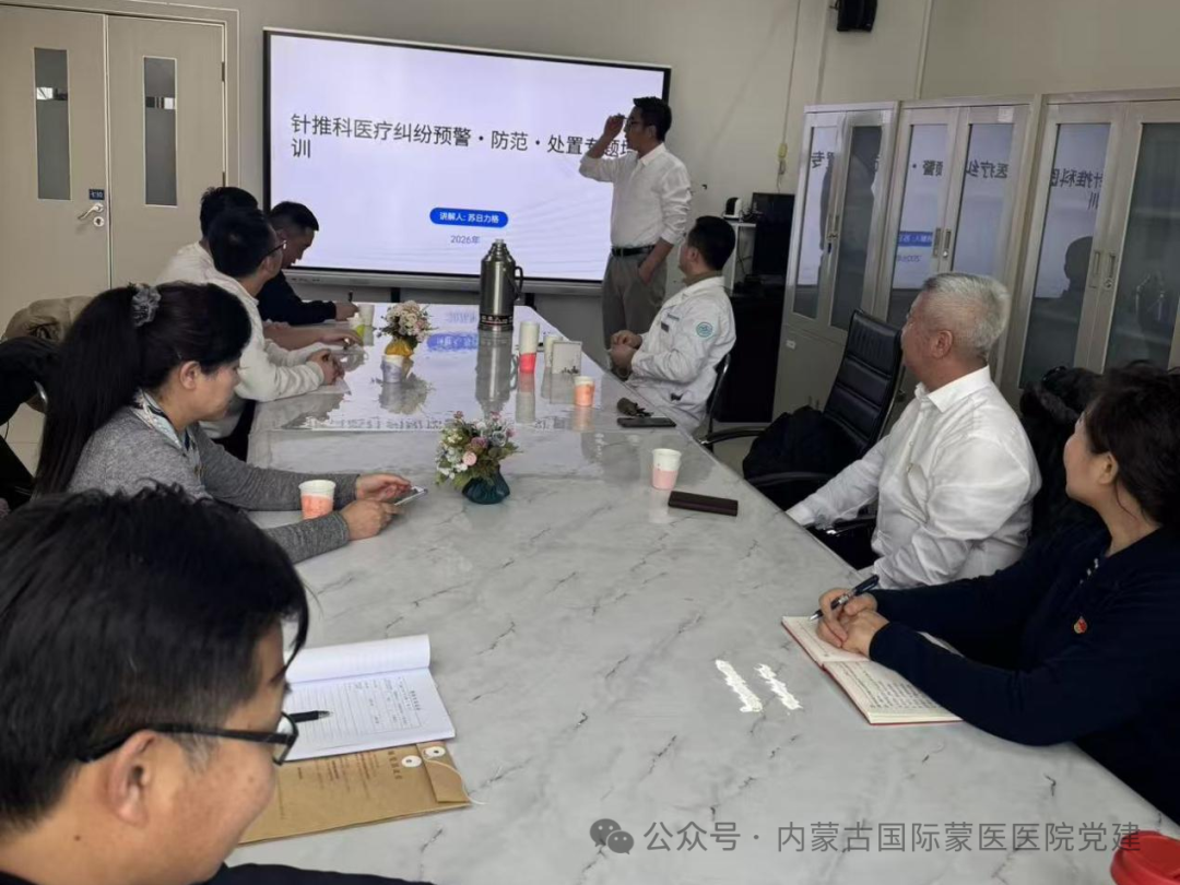 2026年1月15日,内蒙古自治区国际蒙医医院第六党总支第三十八党支部开展主题党日活动。活动现场,医院医患服务中心工作人员以“医疗纠纷预警、防范、处置”为题作了专题培训,培训设置了现场模拟、互动答疑、流程推演等环节,并结合真实案例复盘分析了医疗纠纷中的痛点以及如何识别患者情绪的“预警信号”和针灸推拿治疗过程中存在的“安全隐患”,进一步提升了医务工作者的风险防范与应急处置能力。通过专题培训和深入交流,大家一致认为,唯有将“纠纷处置”转化为“事前预防”,才能实现对患者和医务工作者最有效的保护。